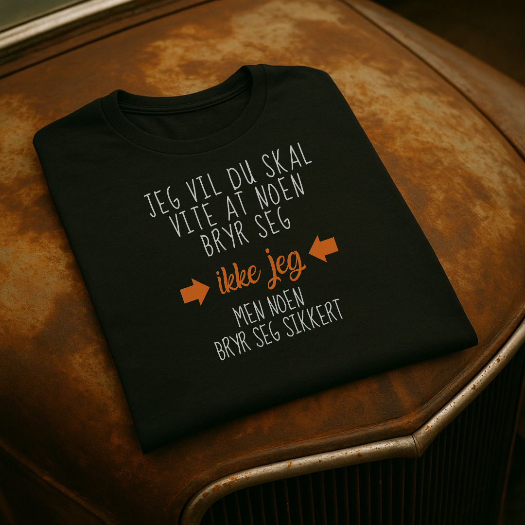 Vis litt holdning med “Ikke Jeg” T-skjorten – med teksten: “Jeg vil du skal vite at noen bryr seg… ikke jeg, men noen bryr seg sikkert.” Perfekt blanding av tørr humor og selvironi som garantert får folk til å le.