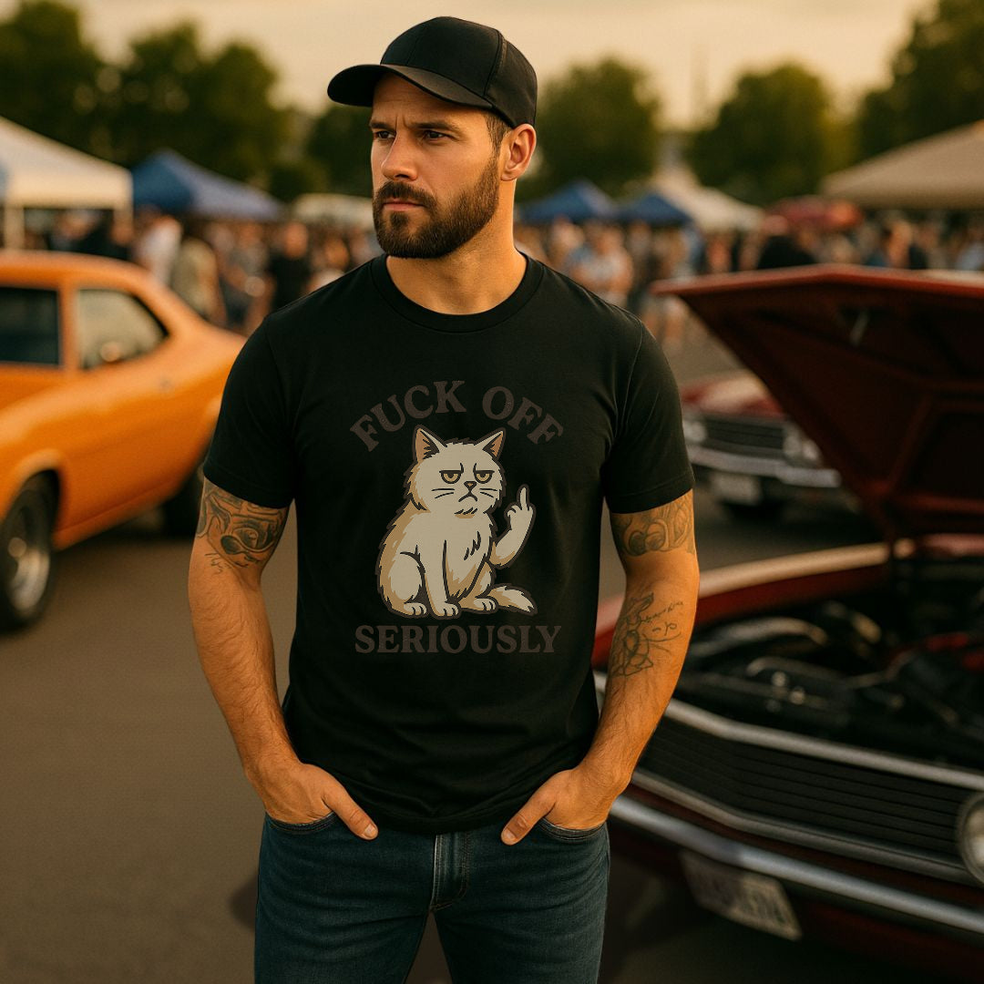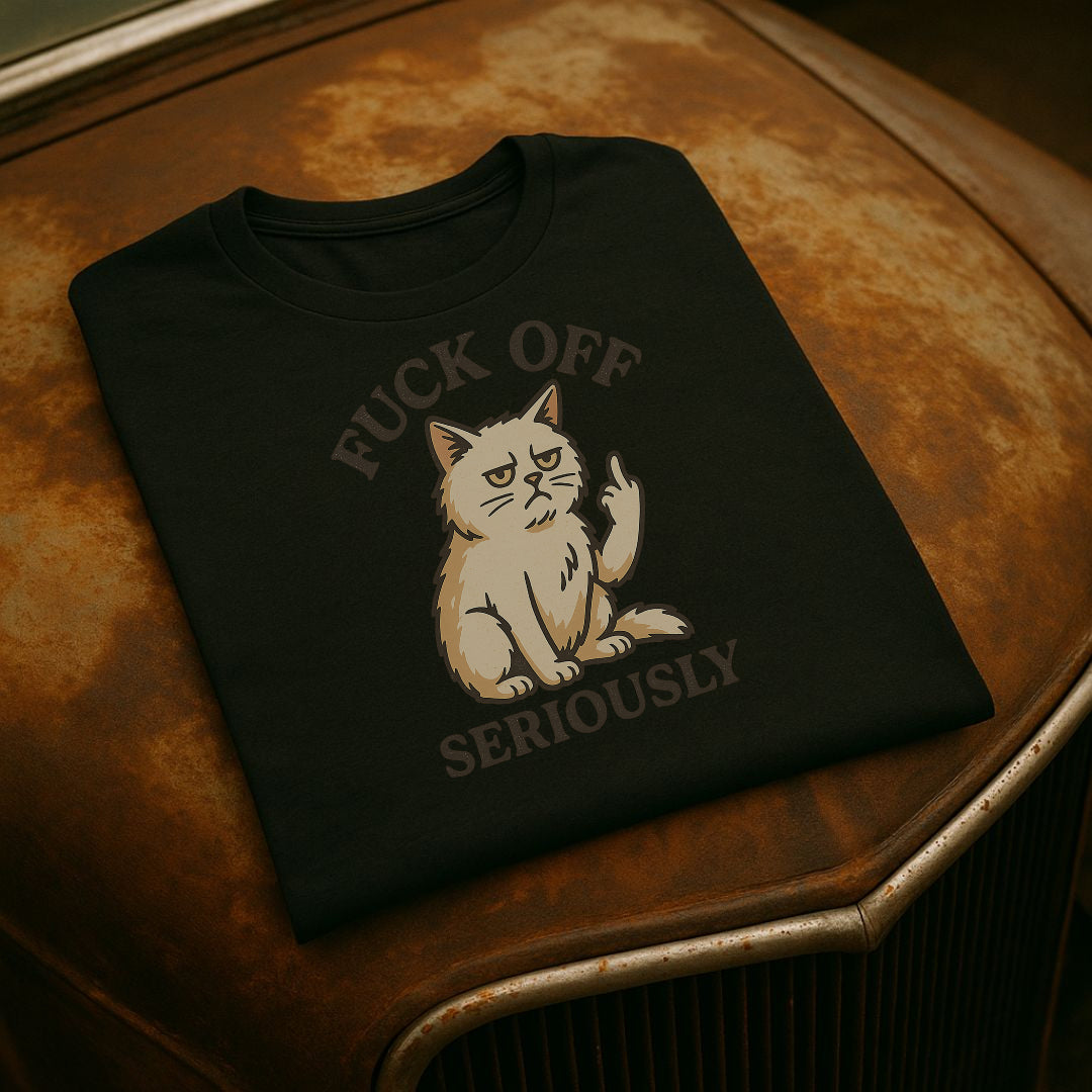 Når “la meg være i fred” ikke helt dekker det – “Fuck Off Seriously” sier det på den ærlige måten. Med en sur katt som viser fingeren, er dette t-skjorten for deg som setter pris på sarkasme, svart humor og litt ekstra attityde.