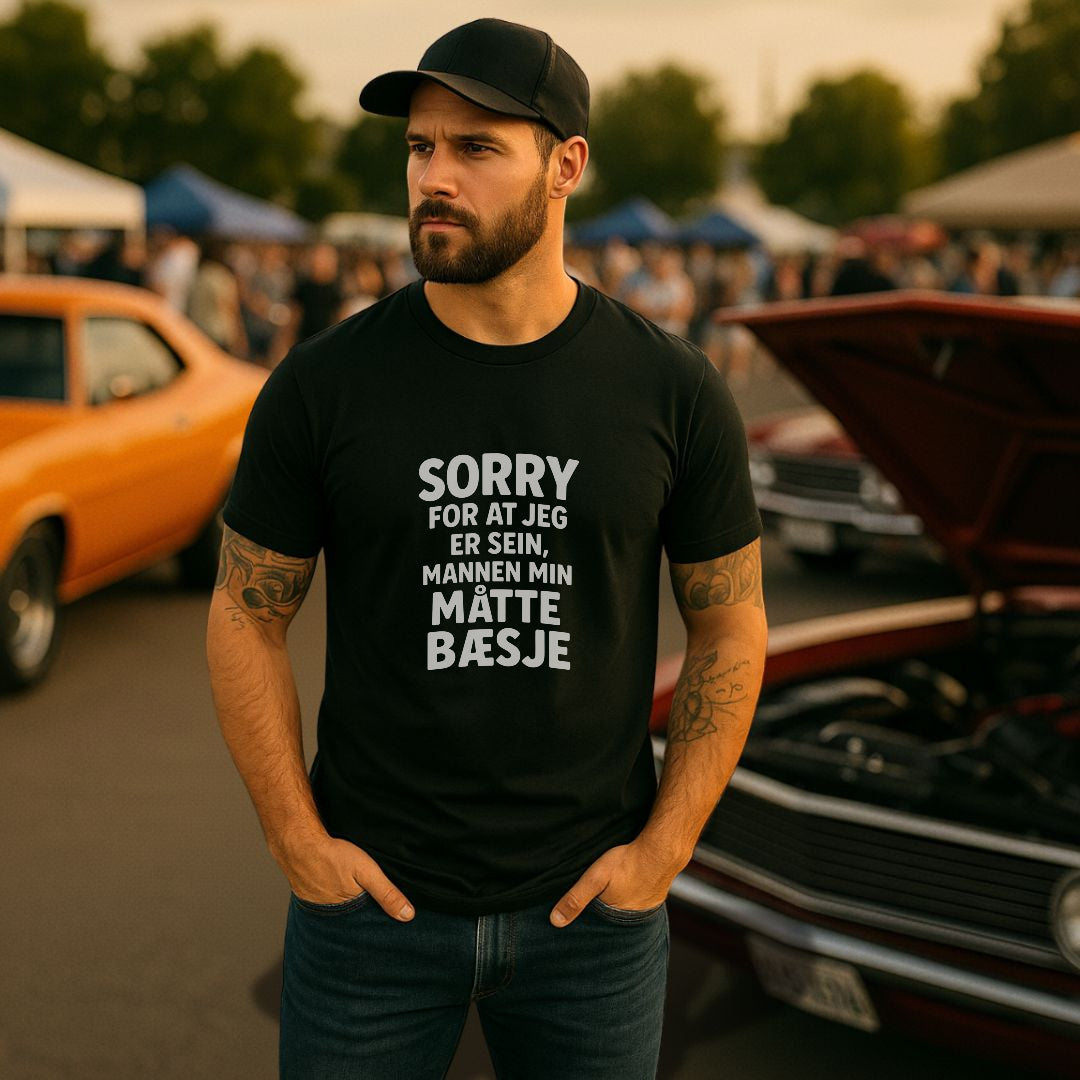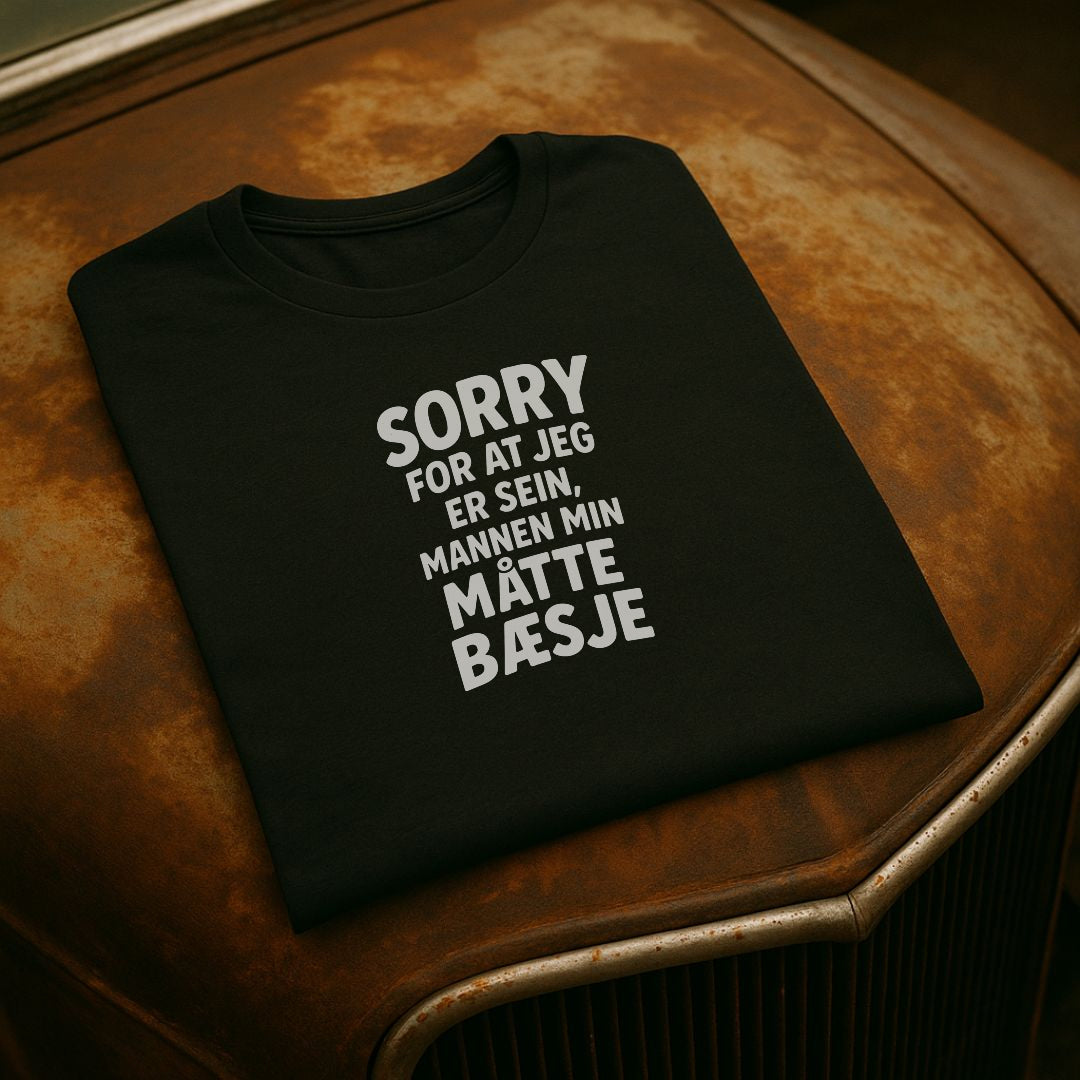 Gi folk en god latter med denne herlige t-skjorta med teksten “Sorry for at jeg er sein, mannen min måtte bæsje”.